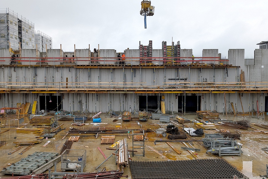 Hinterlüftete Fassade mit einer Bekleidung aus perforierten Glasfaserbetonelementen. Gemeinsam mit den natürlichen Materialeigenschaften verleiht die Perforierung dem Gebäude einen individuellen Charakter sowie eine lebendige Oberfläche.Tragwerkskonzept