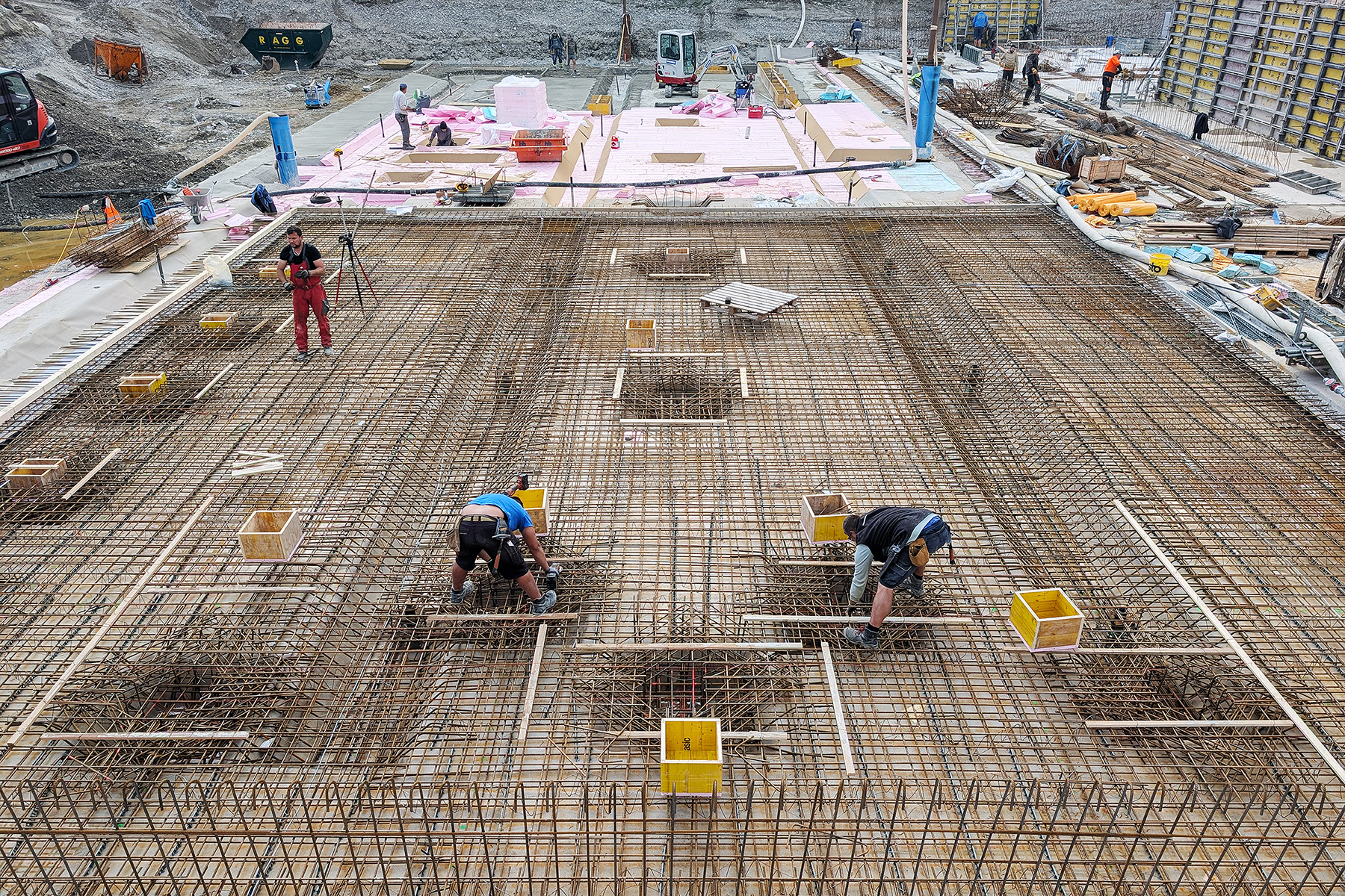 Die Sporthalle wird von 13 einfachen, leicht geneigten und sich in der Höhe verjüngenden Brettschichtholzträgern (BSH) überspannt. Zwischen den einzelnen Trägern im Abstand von ca. 3,8 m bildet eine massive Brettsperrholzdecke (BSP) den erforderlichen Brandschutz (REI) sowie eine - auch bauphysikalisch - robuste Deckenscheibe für den darüber liegenden Dachaufbau, bestehend aus Abdichtung/Dämmung, Drainage, Schüttung sowie Begrünung und allfälligen PV-Modulen. Durch die flache Dachneigung kann eine zusätzliche Gefälleausbildung entfallen. Die natürliche Entwässerung kann im Übergang zur südseitig angrenzenden Geländerampe rigolartig gefasst und abgeleitet werden.