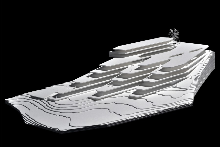 The individual clusters are carefully placed along the contour lines of the sloped site and shifted relative to each other so that the roof of the lower cluster can act as a terrace.